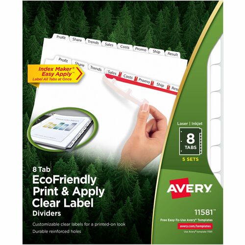 Enhance your productivity with the Avery Laser/Inkjet Dividers, 8-Tab, 5 Sets/PK, 11"x8-1/2",WE from Avery. Perfect for professionals in the office supplies category, this product combines quality and style. Eco-friendly index dividers are made with a high percentage of recycled paper. Print them from any laser or inkjet printer and then use the included Easy Apply label strips to perfectly align and apply all labels at once. Index dividers are great for large projects requiring more than one divider set. Each divider features a white tab and three-hole punched, reinforced binding edge. 8-1/2" x 11" size is designed for use with standard three-ring binders.