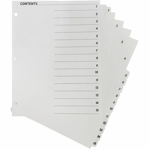 Enhance your productivity with the Business Source Index Dividers,w/TOC Page,1-15, 15 Tabs/ST,11"x8-1/2",White from Business Source. Perfect for professionals in the office supplies category, this product combines quality and style. Make organization quick and easy using a black/white Table of Contents page that coordinates with included dividers with numbered tabs. Key in or type section titles and then print or copy onto the Table of Contents page preprinted with numbers that match the dividers. Edges and white tabs feature Mylar reinforcement to prevent tearing. Three-hole punched edges allow easy, quick placement into standard-size, three-ring binders. Index dividers are compatible with all laser and inkjet printers and include easy-to-follow instructions.