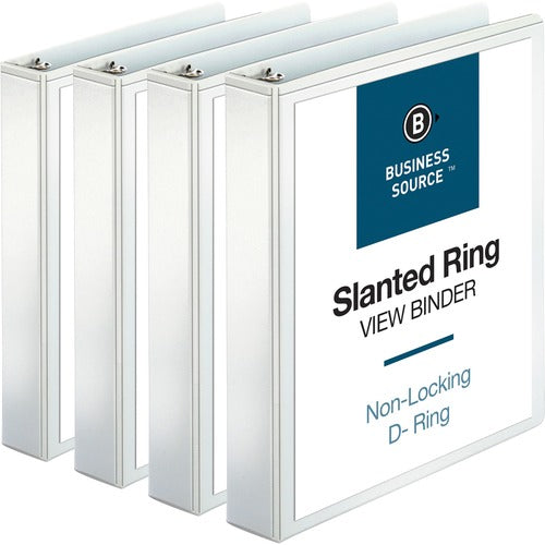 Enhance your productivity with the Business Source D-Ring Binders, w/Pockets, 1-1/2" Cap, 8-1/2"x11", 4/BD, WE from Business Source. Perfect for professionals in the office supplies category, this product combines quality and style. Basic D-Ring View Binder offers a clear, nonglare overlay on the front, back and spine for easy customization and identification. Slant-D rings hold 25 percent more paper than traditional binders. Back-mounted metal rings allow pages to lie flat. Two triggers on the ring mechanism provide easy access to your letter-size documents. Clear pockets on the inside covers offer extra document storage with a 30-sheet capacity for each pocket. Design also features a sturdy chipboard core and exposed rivets. Three-ring binder is made of polypropylene.